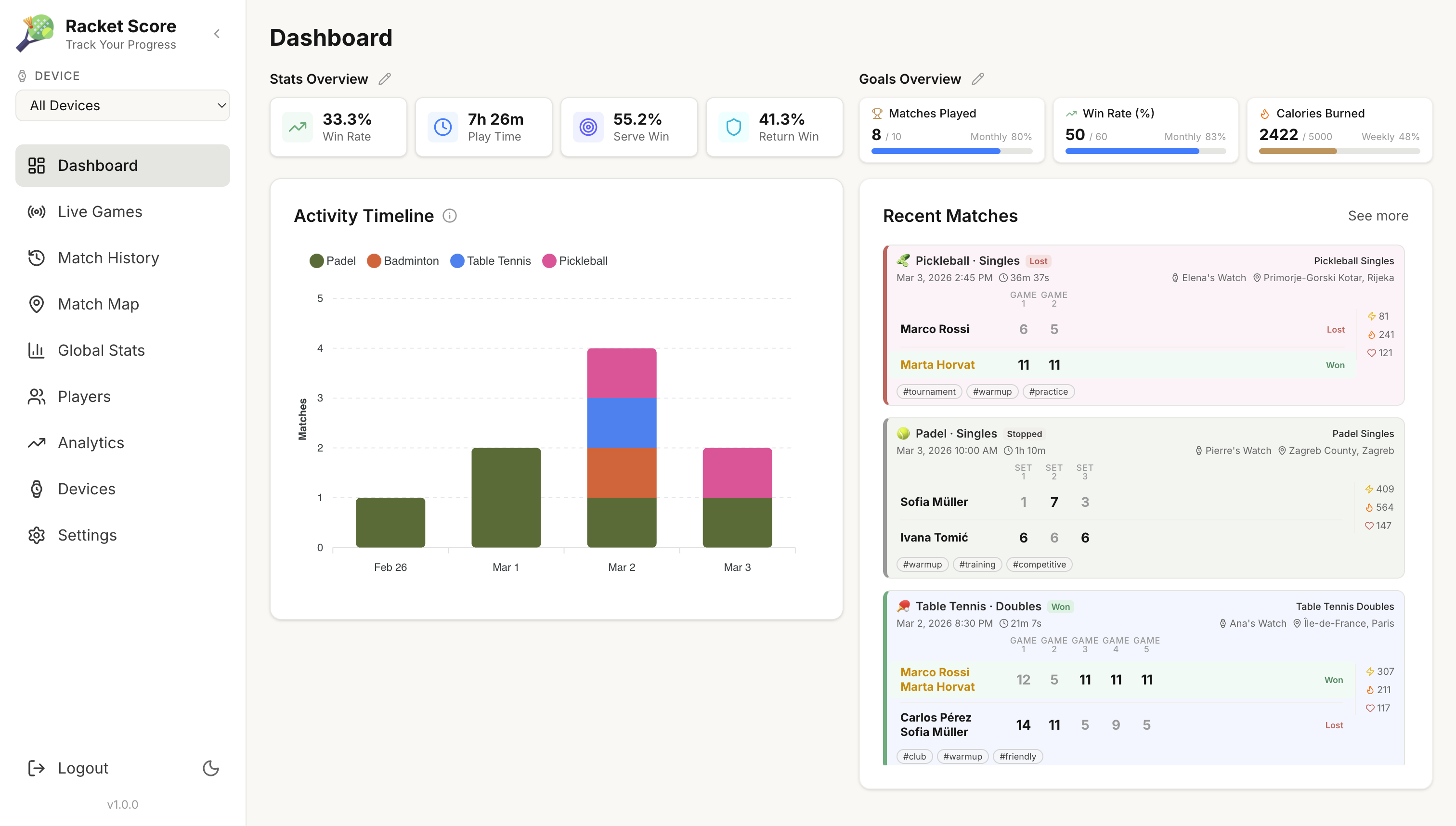 Open the dashboard and you immediately see where you stand. Win rate, play time, serve percentage, return wins. Your recent matches are right there with full scores and tags. Set weekly goals and track them without opening a spreadsheet.
