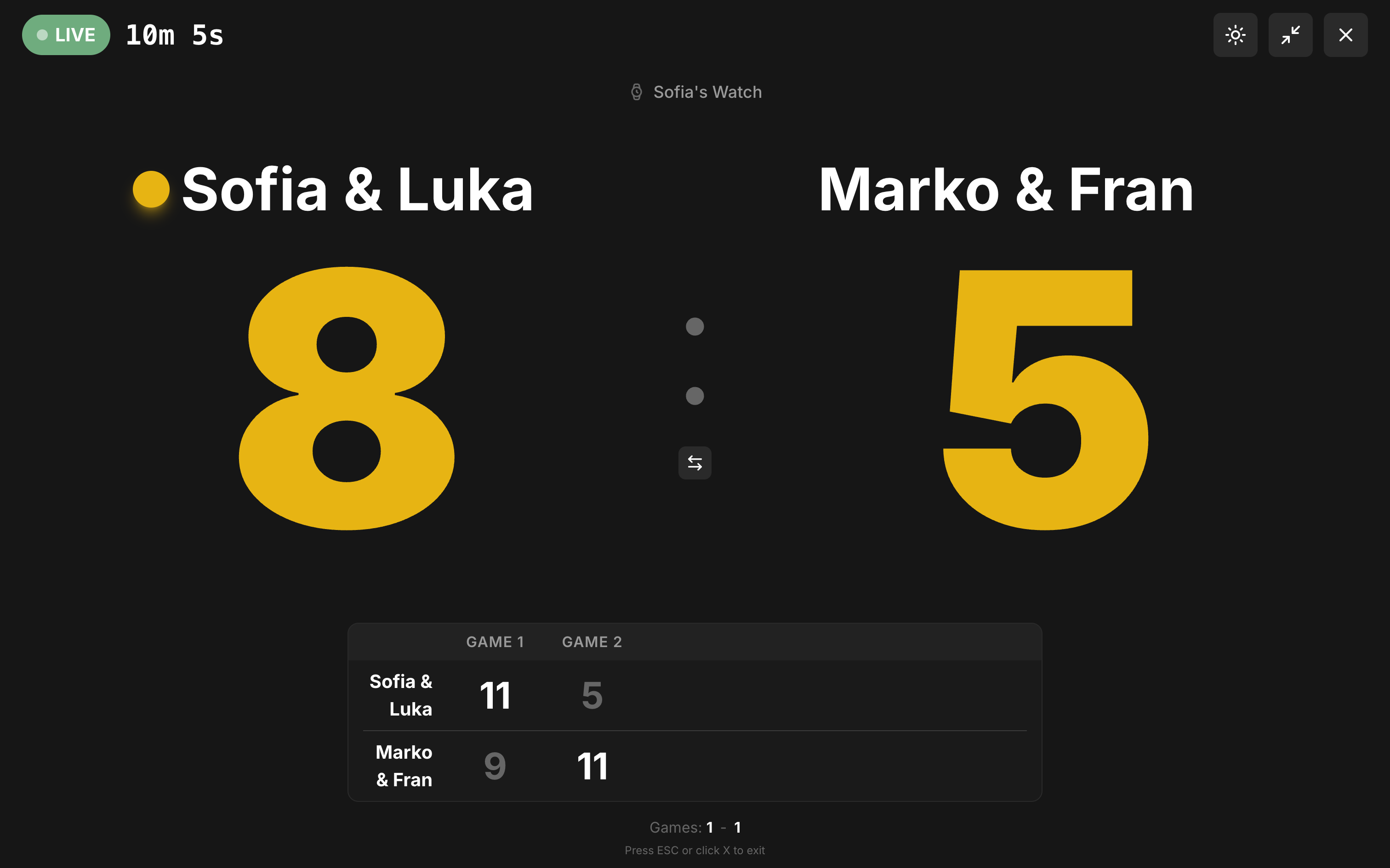 While you play, the live scoreboard streams the match to any browser. Friends waiting for the next court, your coach at home, or just your phone on the bench. Big, clean numbers that update in real time, point by point.