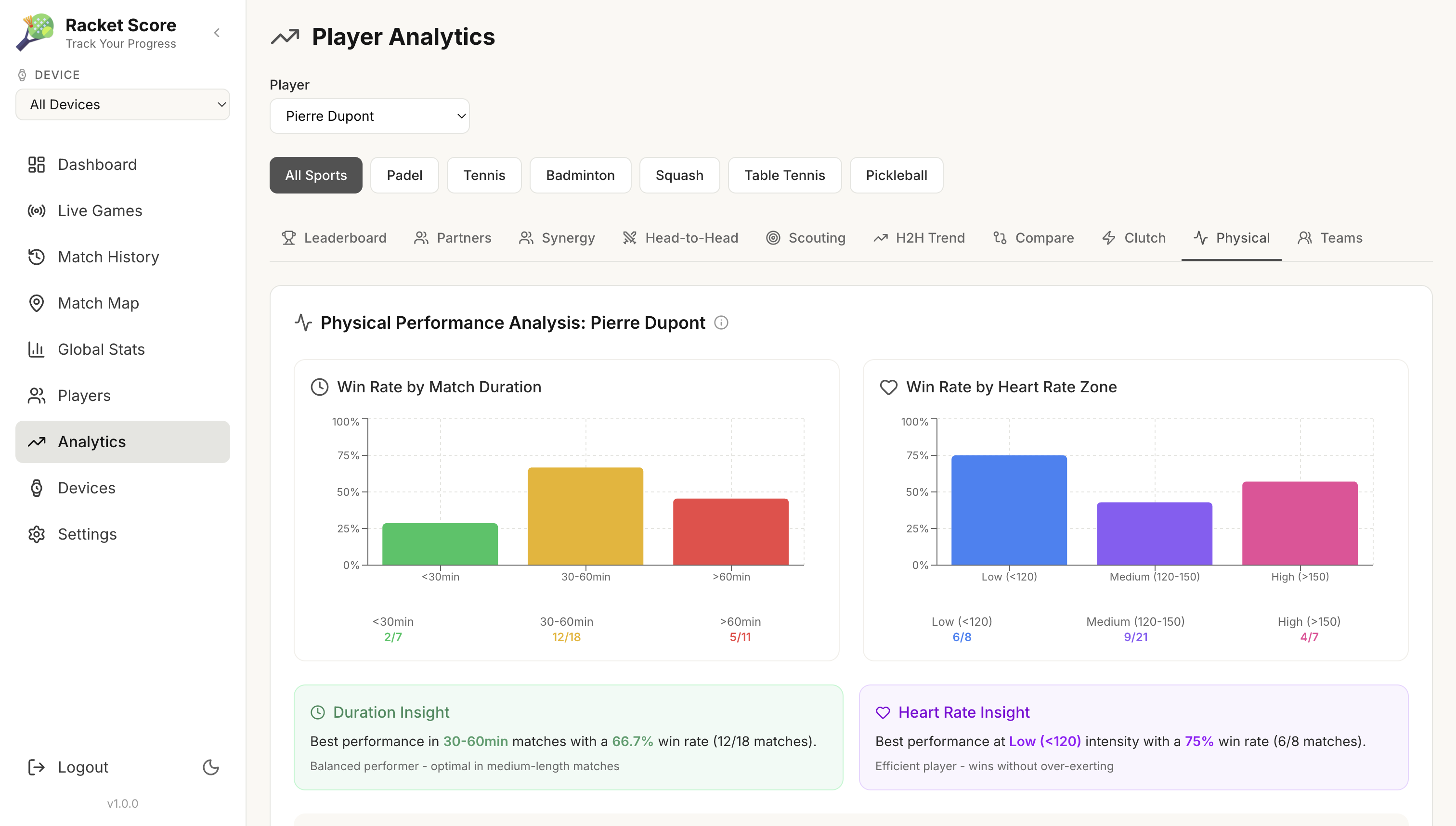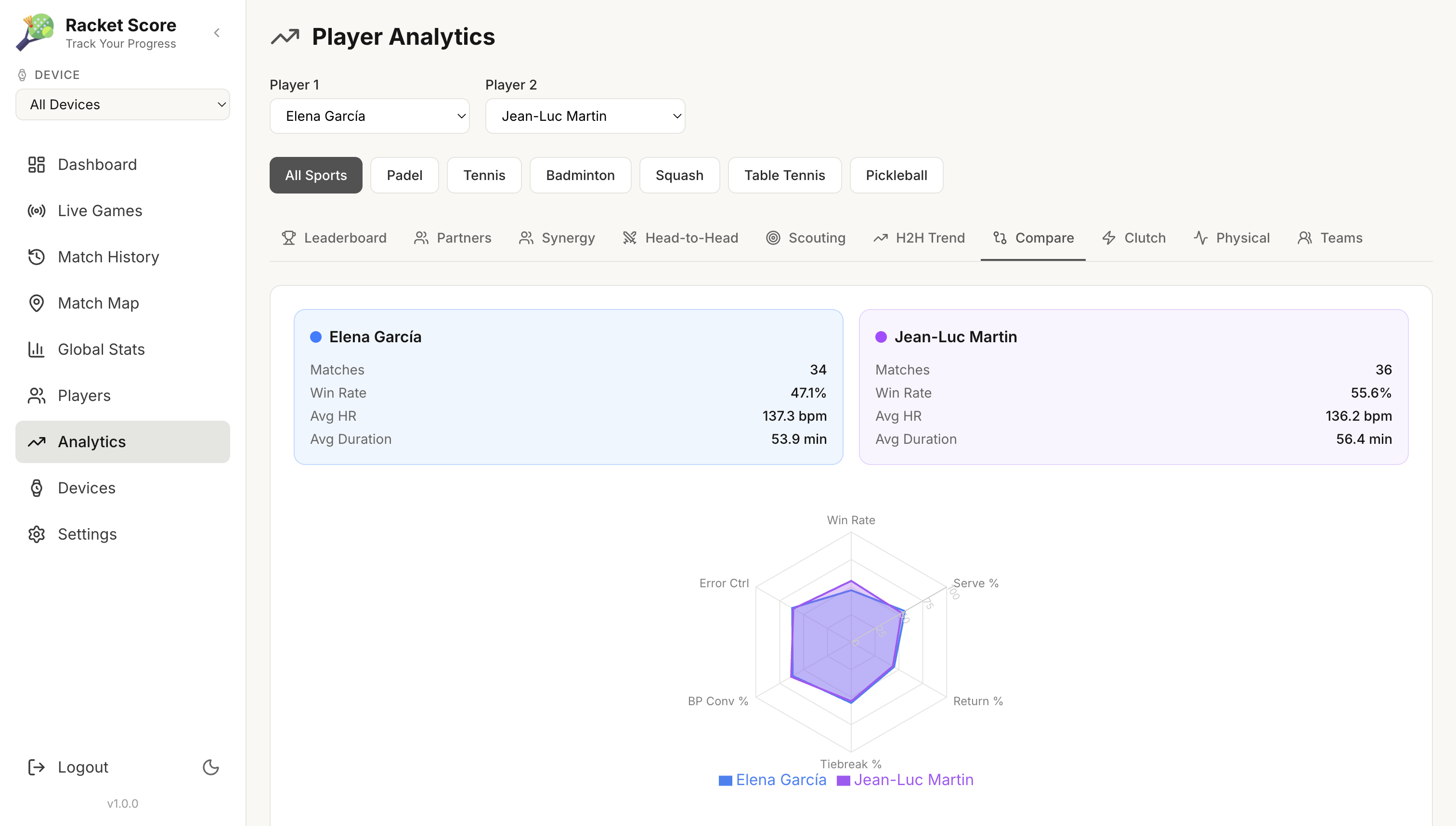 Do you win more in shorter matches or longer ones? What's your win rate when your heart rate stays low? How do you stack up against a specific opponent across serve %, return %, clutch moments, and tiebreaks? Pick any two players and compare them side by side.